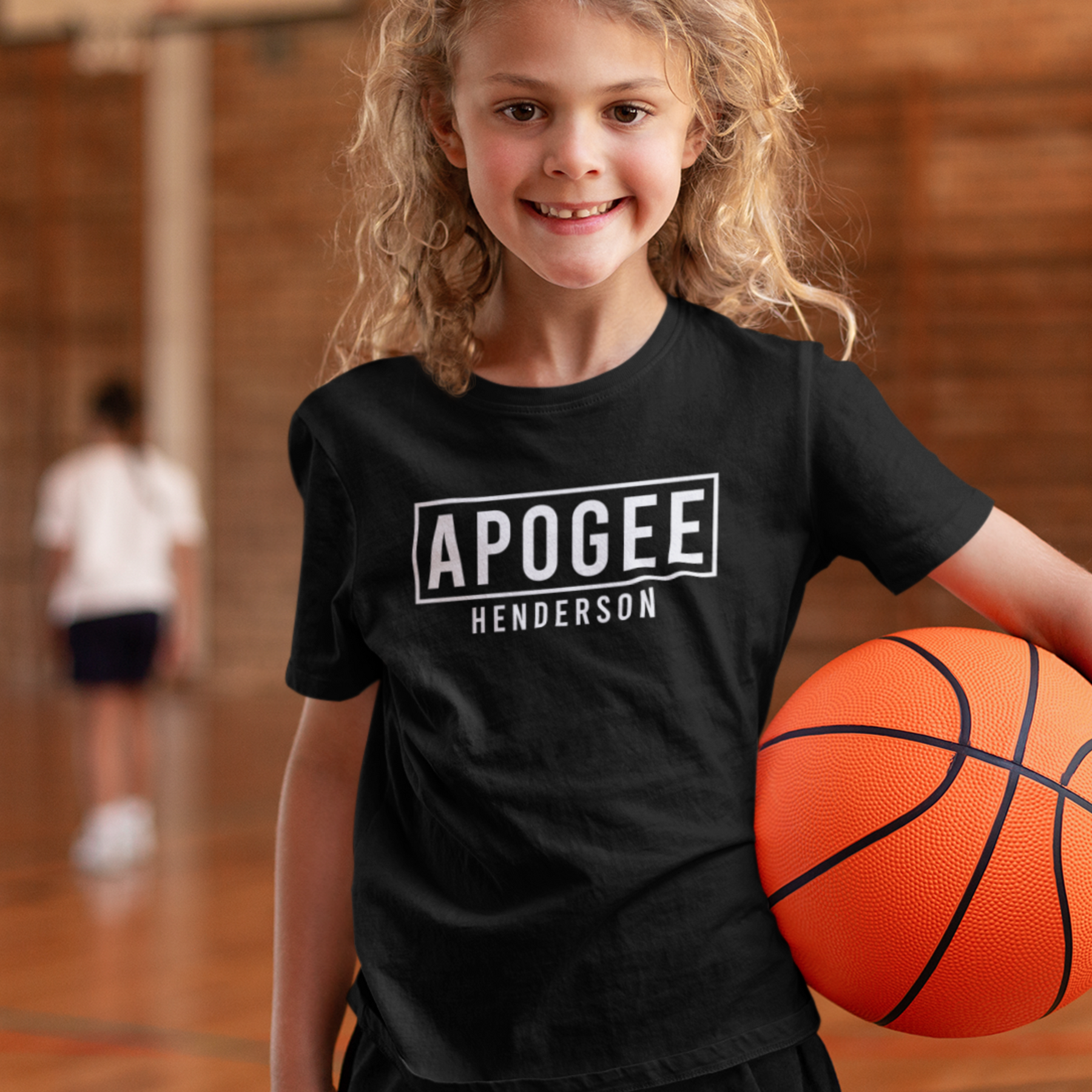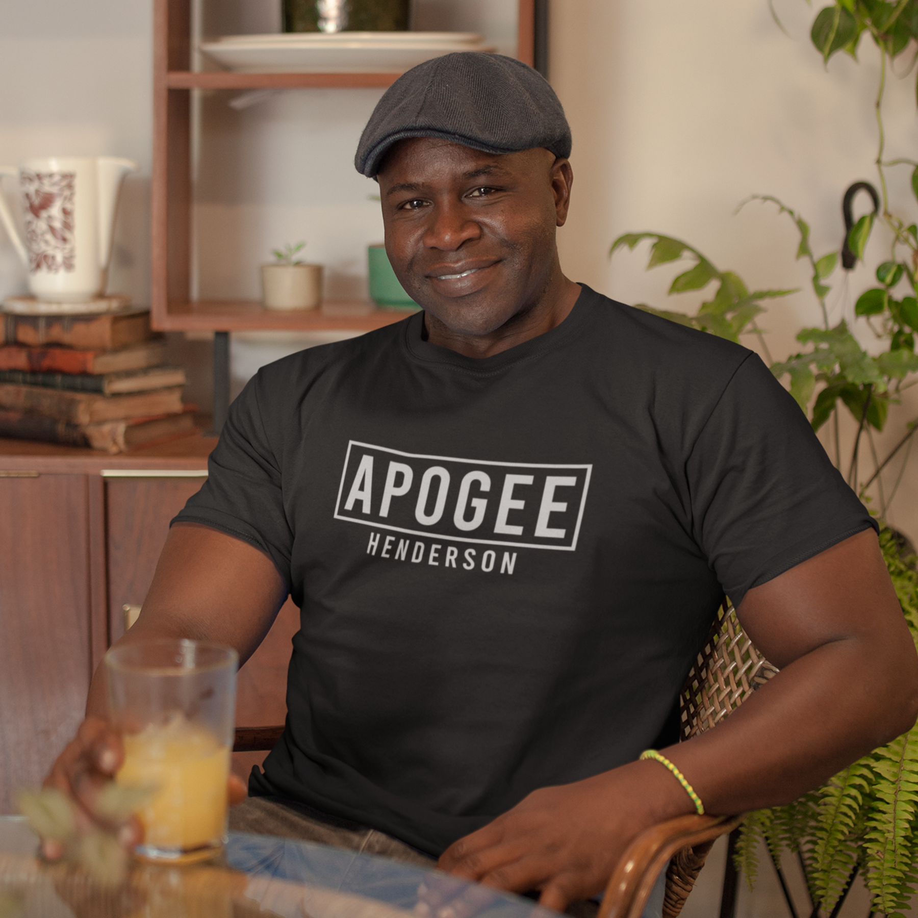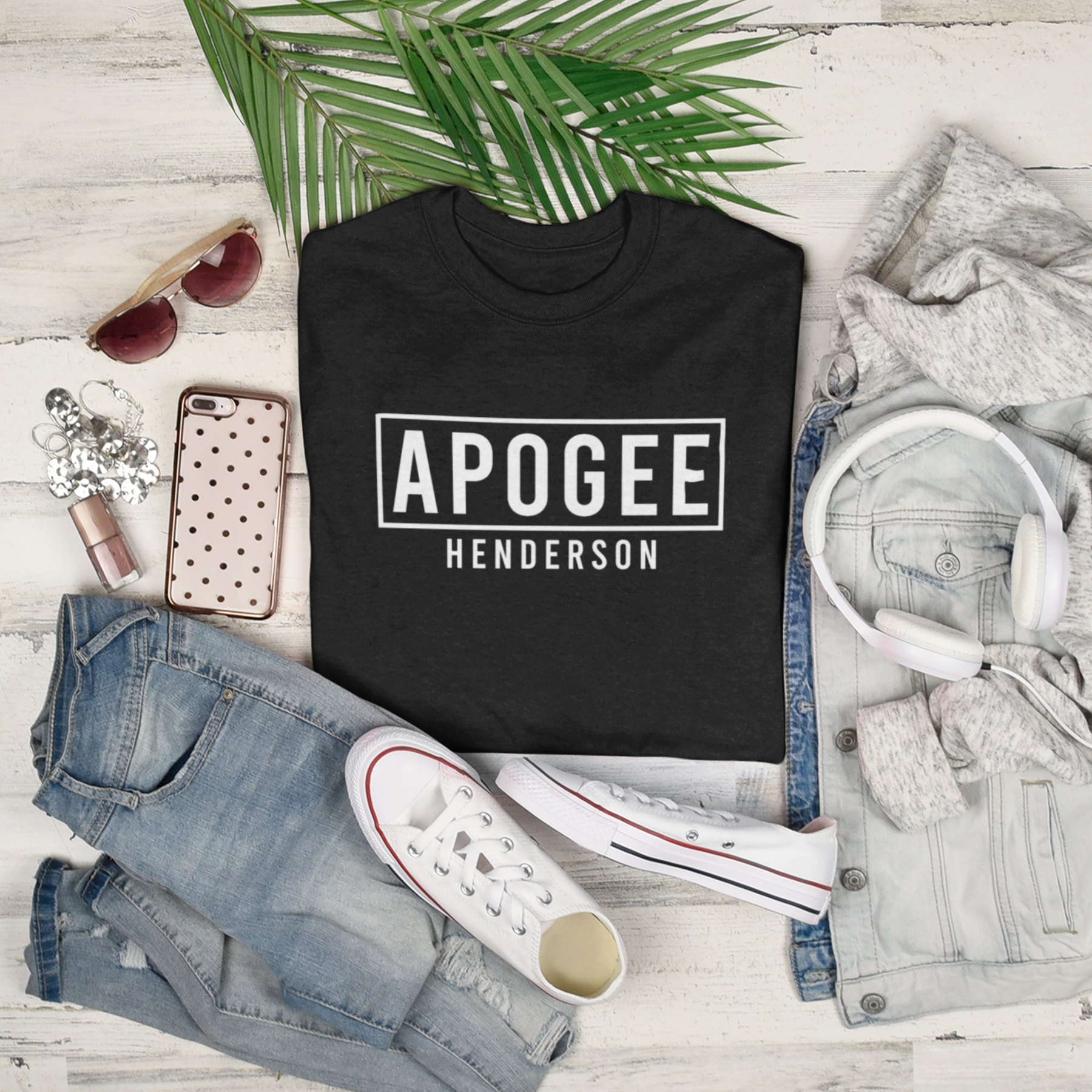 The Modern Apogee Henderson Logo Tee features a clean, minimalist design printed in white on a black shirt. This shirt is designed for everyday comfort and school spirit. It is suitable for students, parents, staff, and supporters.